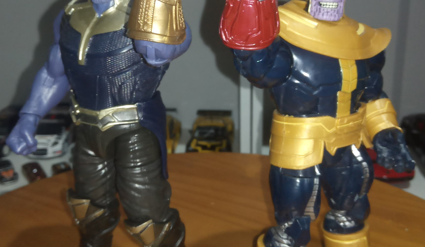 El calce del Guantelete no funciona con la figura de Ironman, con cierta logica dado que esta en "versión grande" y sea probablemente para utilizarlo con la figura de Hulk, o la de Thanos. Casualmente tengo un Thanos versión comic, al cual le va de lujo. Lo compare con su homonimo versión Infinity War, y si bien pierde en el rubro cuerpo en respecto al detalle, me resulta mejor lograda la cabeza. De una forma u otra esta destinado a conseguir el famoso Guantelete.