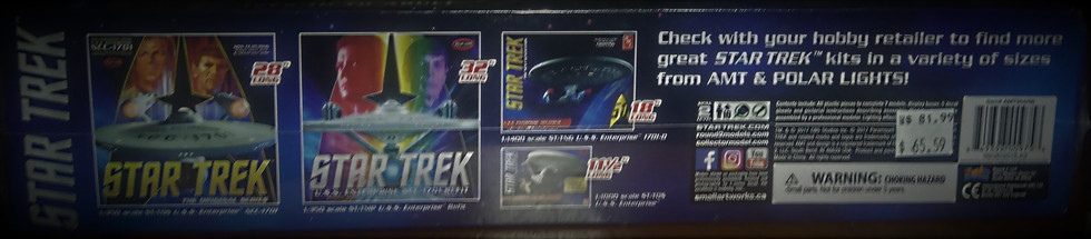 La caja es bastante sobria, pero informativa. Trae el detalle de cual fue la escala considerada para cada modelo, mostrando el tamaño real de cada uno armado, mas la longitud de cada nave en la serie y/o película. Y ayuda a tener una buena perspectiva de comparación entre todas las Enterprise, ya que las mismas están (entre si) dentro de la misma escala.