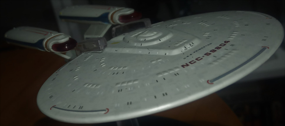 Volviendo a las Eaglemoss, desde la Warbird (o Pájaro de Guerra) Romulano hasta la Princeton, el nivel de detalle es ampliamente cuidado, teniendo en cuenta también las dimensiones de las mismas (son de 10 cm de longitud, en promedio). Impecable la pintura, y también las piezas acrílicas. Inclusive los soportes son excelentes, ya que los "sujetadores" (quizás nombre poco feliz, pero no se como llamarlos en su defecto...) son traslucidos, ayudando a que no se pierdan detalles del vehículo; las bases tienen en su apoyo elementos antideslizantes, para evitar accidentes indeseados. Escalas (otra vez)... bueno, entre las naves ("otra" otra vez) no hay correlación, y tampoco una escala determinada para cada una (igual, si se quisiera, basta con buscar en sitios oficiales las medidas de las naves, y dividir dicho valor por la longitud del modelo, y listo).